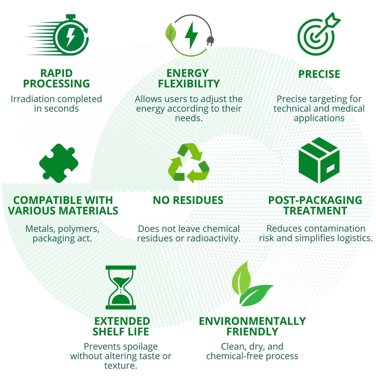 Electron Beam (E-Beam) irradiation uses an electron accelerator to generate high energy particle radiation. This characteristic makes it ideal for low to medium density products, such as plastic packaging, thin products, and surface decontamination. The process's speed is a key advantage, and it leaves no residue.